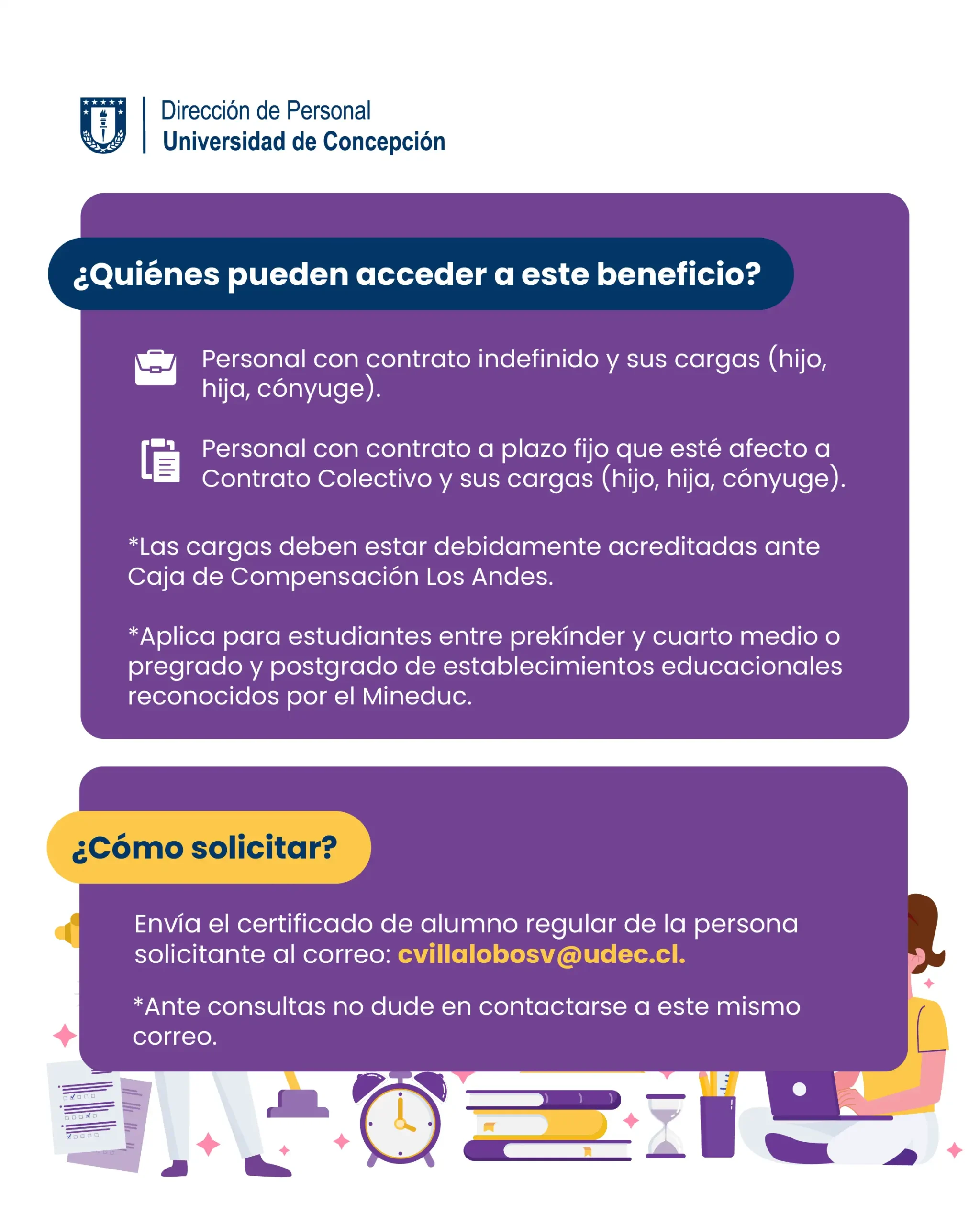 Este beneficio tiene como propósito apoyar los gastos asociados al año académico de quienes se encuentran estudiando o tienen hijos, hijas o cónyuge estudiantes registrado como carga familiar.
