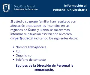 Si usted o si su grupo familiar han resultado con afectación a cauda de los incendios informar su situación al correo dirper@udec.cl.